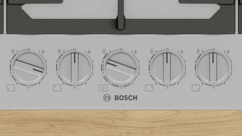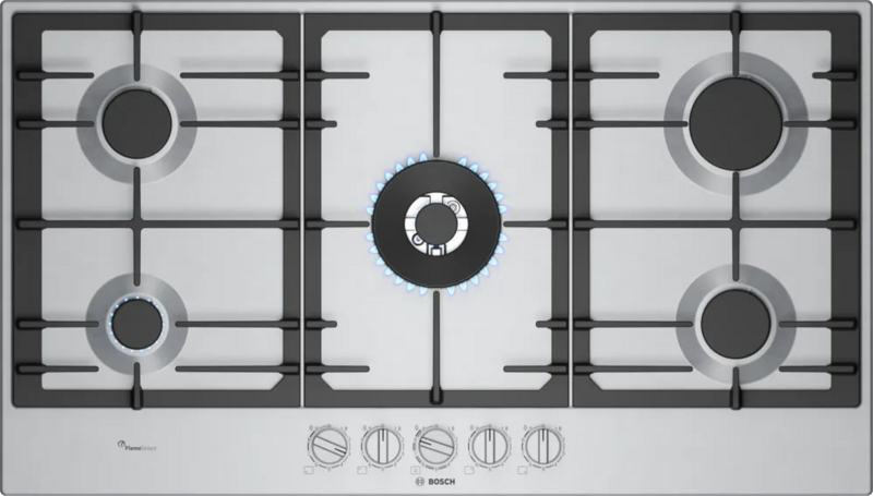 Варочная панель Serie 6, газовая варочная панель,90 см,нержавеющая сталь, 5 конфорок, 1 WOK-конфорка c 2 контурами пламени, 1 конфорка повышенной мощности ,чугунные решетки,газ-контроль, автоматический электроподжиг, сделано в Испании