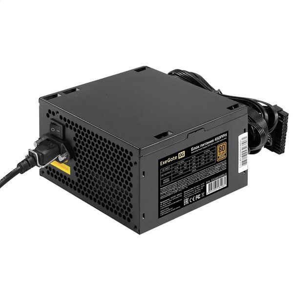 Блок питания Блок питания 450W ExeGate 80 PLUS® Bronze 450PPH-S (ATX, APFC, SC, КПД 88% (80 PLUS Bronze), 12cm fan, 24pin, (4+4)pin, 2xPCI-E, 3xSATA, 3xIDE, кабель 220V 1,8м с защитой от выдергивания, black, Color Box)
