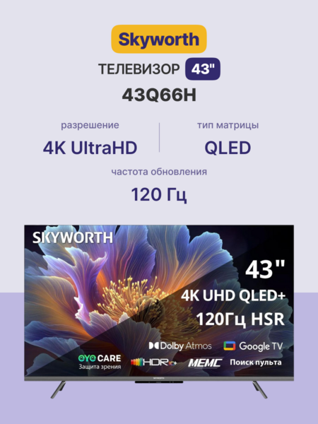 Телевизор 43", Ultra HD, QLED, 300Nit, Google TV, DVB-T2/C/S2, 2.0 ch Sound 10W*2 Dolby Atmos, 120Hz, 3 HDMI, 2 USB, Digital Audio Output, LAN, Composite output, CI, Выход для наушников, 2 Pole, 2025