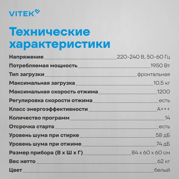 Стиральная машина Vitek VT-WFE9201 класс: A+++ загр.фронтальная макс.:10.5кг белый инвертор