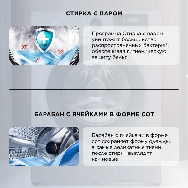 - блокировка от случайного нажатия, дисплей, защита от детей, защита от перегрева, контроль дисбаланса, контроль уровня пены, отключение звукового сигнала, самодиагностика неисправностей, таймер отсрочки запуска