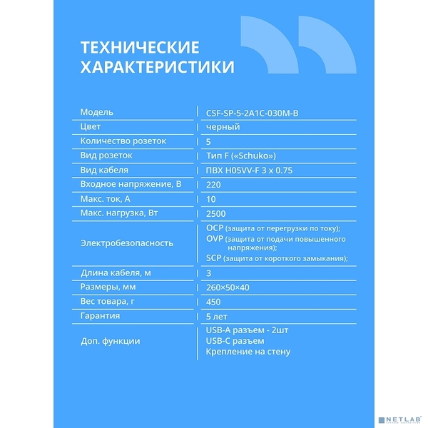 CBR Сетевой фильтр CSF SP-5-2A1C-030M-B, 10A, 5 евророзеток, 2x USB Type-A 2.0, 1x USB Type-C, 3x0.75мм2, 3 м, чёрный купить в интернет-магазине TPShop.Ru. Наличный и безналичный расчет, розничные и оптовые продажи. Самовывоз, доставка по Москве и МО, отправка во все регионы России.