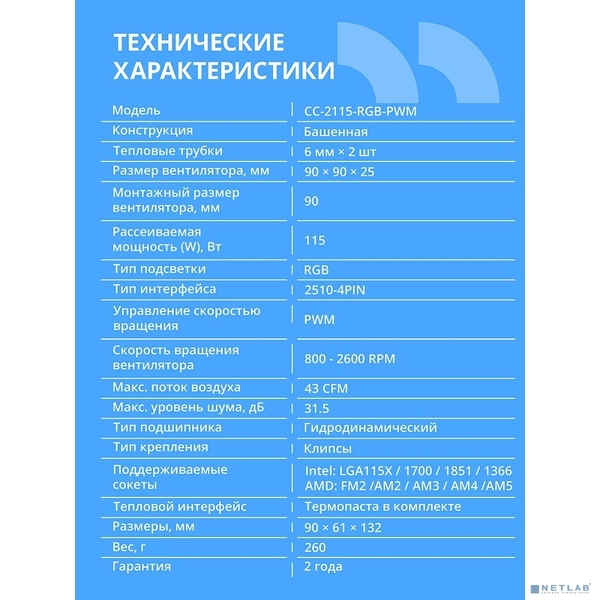 CBR-CC-2115-RGB-PWM Кулер для процессора, Al+Cu, 2 heat pipes, Socket 775/1155/1156/1150/1151/1200/1700/940/AM2/АМ2+/АМ3/AM3+/FM1/FM2/AM4/AM5, TDP 115W, 90mm Fan, 2600RPM, HB, RGB, PWM, 32db купить в интернет-магазине TPShop.Ru. Наличный и безналичный расчет, розничные и оптовые продажи. Самовывоз, доставка по Москве и МО, отправка во все регионы России.