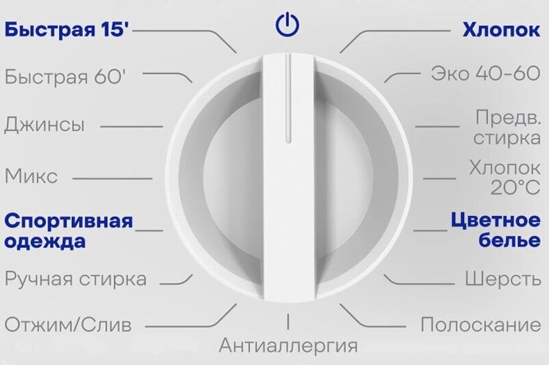 - Быстрая'15; Быстрая'60; Хлопок; ЭКО 40-60°C; Хлопок 20°C; Цветное белье; Шерсть; Ручная стирка; Антиаллергия; Спортивная одежда; Микс; Джинсы; Предварительная стирка; Полоскание; Отжим/Слив