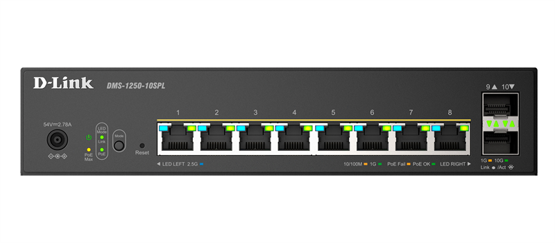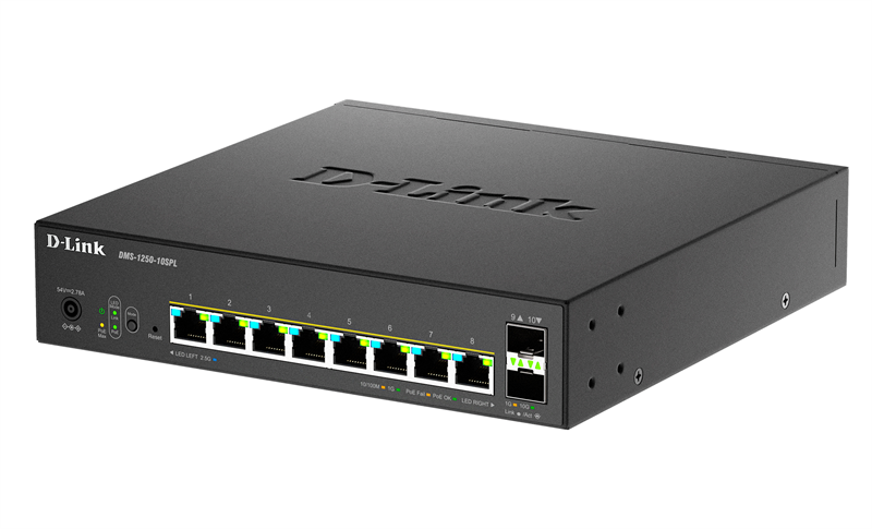 - D-Link Управляемый L2 PoE-коммутатор, 8x2.5GBase-T PoE (2 порта PoE 802.3bt 60 Вт), 2x10GBase-X SFP+, PoE-бюджет 120 Вт, защита от статического электричества до 6 кВ, CLI