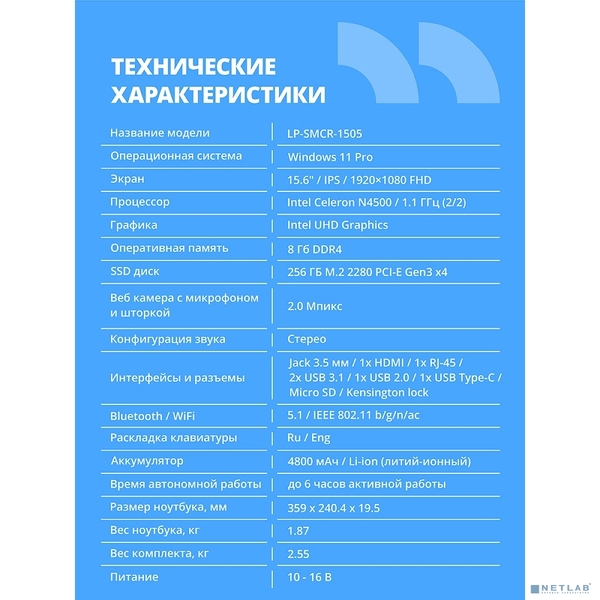 Ноутбук CBR LP-SMCR-1505 15.6" FHD IPS (Intel Celeron N4500/8Gb DDR4/256Gb M.2 SSD/Intel UHD Graphics/RJ45/W11 Pro/4800mAh/пластик) купить в интернет-магазине TPShop.Ru. Наличный и безналичный расчет, розничные и оптовые продажи. Самовывоз, доставка по Москве и МО, отправка во все регионы России.