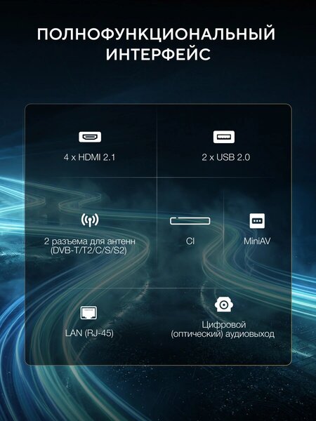 - CI+/PCMCIA, HDMI, RJ-45 (Ethernet), S/PDIF (оптический), USB Type-A