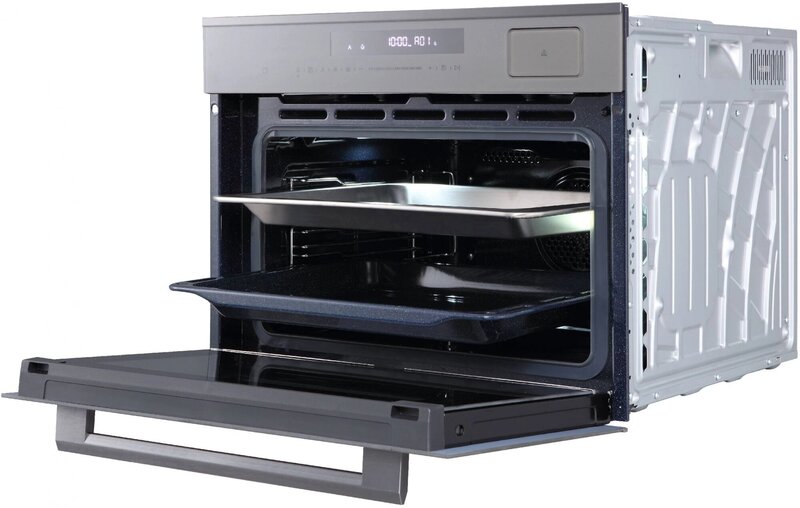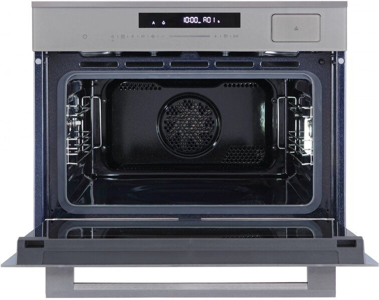 - вентилятор охлаждения, двухуровневое освещение, дисплей, полностью стеклянная внутренняя поверхность дверцы духовки, термощуп