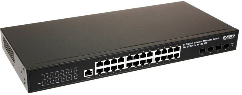 - OSNOVO SW-24G4X-L2 Управляемый L2+ коммутатор Gigabit Ethernet на 28 портов. Порты: 24 x GE (10/100/1000Base-T) + 4 x 1G/10G SFP+ Uplink. Консольный порт, Уровень управления L2+. Поддержка Jumbo Frame