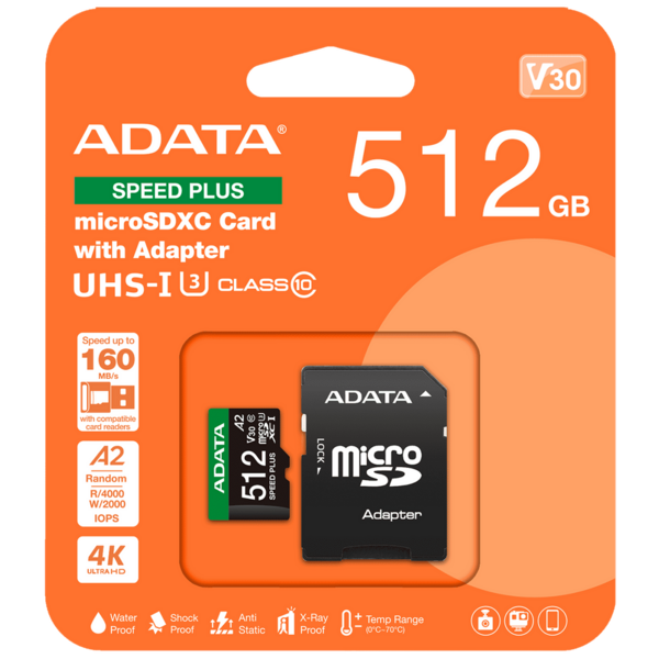 Карта памяти ADATA microSDXC 512GB ADATA Speed Plus UHS-I U3/V30/A2, до 180/160 MB/s, Durable (Water-/Shock-/X-Ray-Proof) купить в интернет-магазине TPShop.Ru. Наличный и безналичный расчет, розничные и оптовые продажи. Самовывоз, доставка по Москве и МО, отправка во все регионы России.