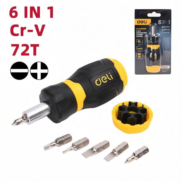 Отвертка с трещоткой с набором бит 6-в-1 Deli DL636182N 6 бит Cr-V (SL5,SL6,PH0,PH1,T10,T20), трещотка 72 зуба купить в интернет-магазине TPShop.Ru. Наличный и безналичный расчет, розничные и оптовые продажи. Самовывоз, доставка по Москве и МО, отправка во все регионы России.