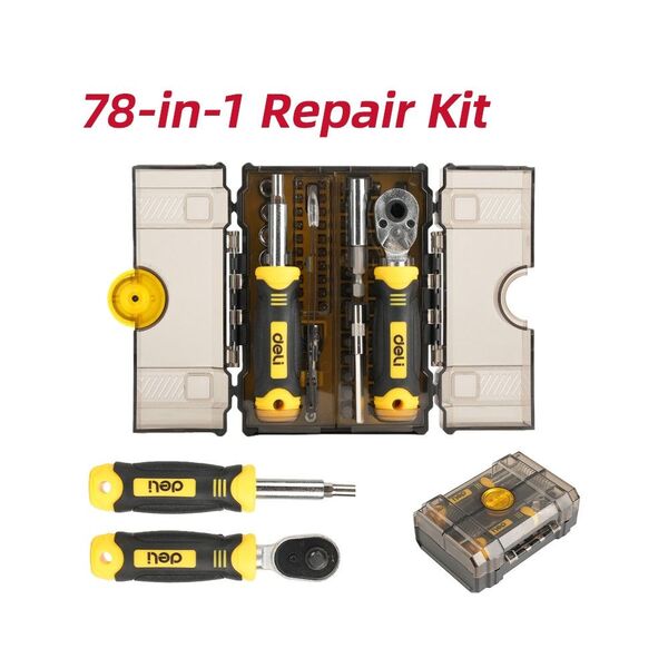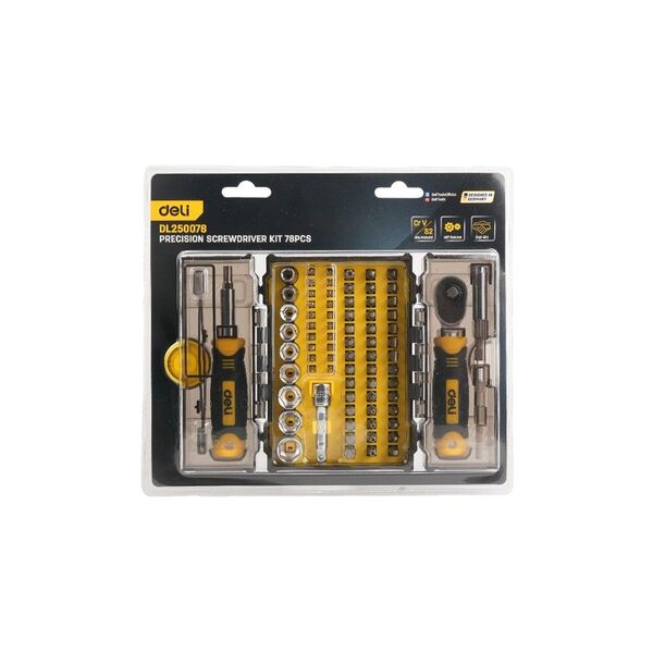 Набор бит и торцевых головок с отверткой, ключем-трещоткой и пинцетом 78-в-1 Deli DL250078 (61 бита + 9 головок + 5 удлинителей), пласт.кейс