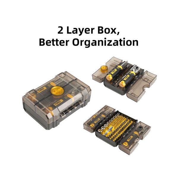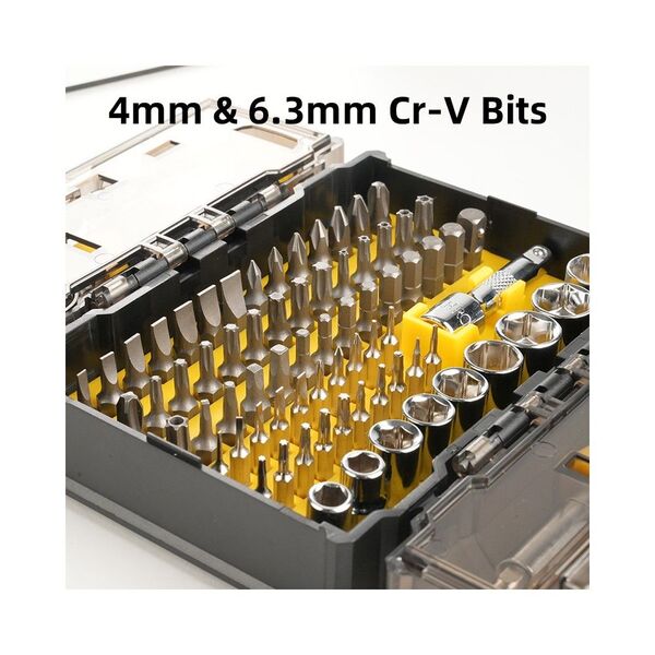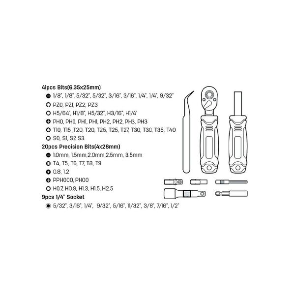 - Набор бит и торцевых головок с отверткой, ключем-трещоткой и пинцетом (61 бита + 9 головок + 5 удлинителей), кейс
