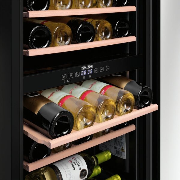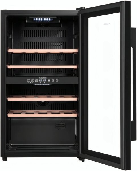 - Шкаф имеет две зоны, для каждой из них можно задать свой режим охлаждения — это актуально для тех, кто планирует хранить дома разные виды напитка: красное, белое, шампанское.