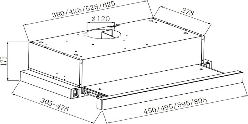 Встраиваемая телескопическая вытяжка, 50 см, отвод / циркуляция, механический контроль, 2 скорости работы, производительность 710 м3 / ч, LED освещение, фронтальная панель - нержавеющая сталь, 216*500*285-470