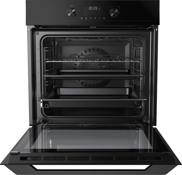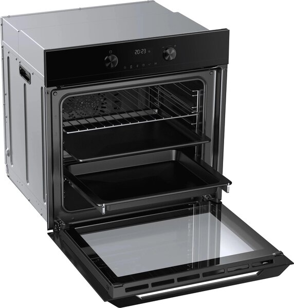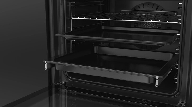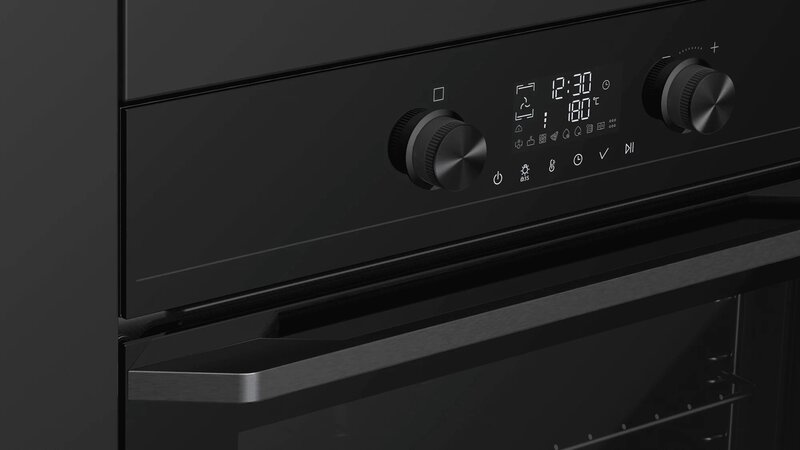 - вентилятор охлаждения, дисплей, полностью стеклянная внутренняя поверхность дверцы духовки, телескопические направляющие, электронный программатор