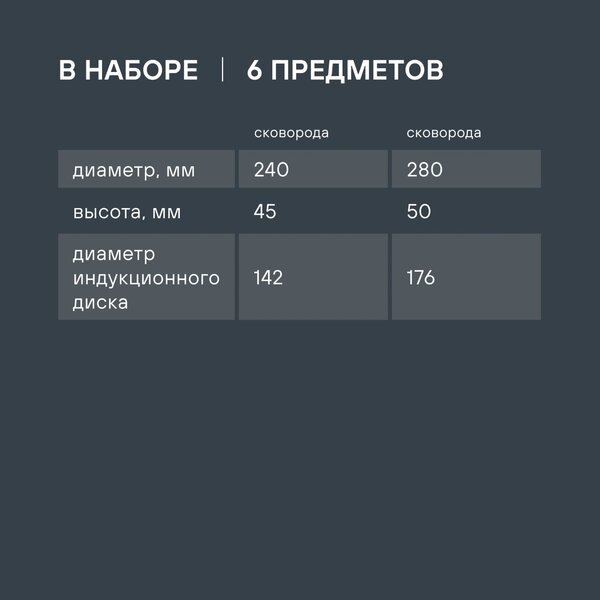 - Сковорода 24см, сковорода 28см, ковш с крышкой 16см, кастрюля с крышкой 24см