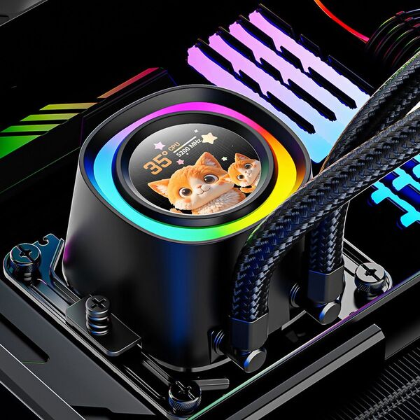 - RGB подсветка и дисплей на водяном блоке (1.48", 240x240, 300кд/кв.м, 262K цветов)