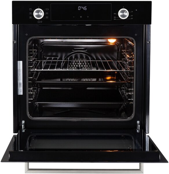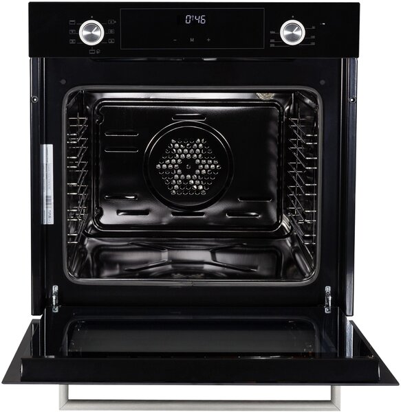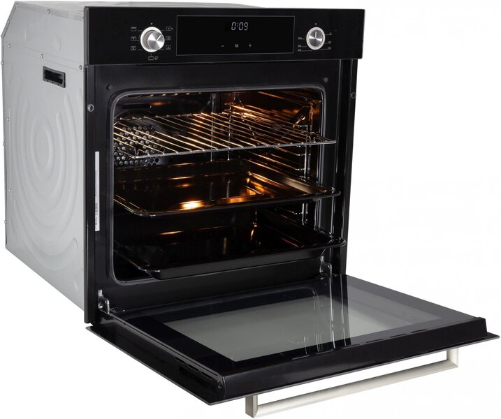 - вентилятор охлаждения, дисплей, полностью стеклянная внутренняя поверхность дверцы духовки, электронный программатор