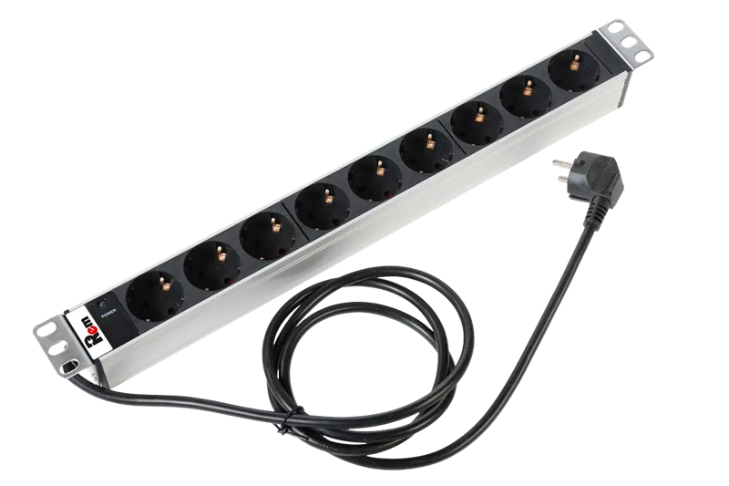 - Блок силовых розеток имеет девять портов стандарта Schuko, выполнен в анодированном алюминиевом корпусе. Розетки расположены под углом 45%, для удобного подсоединения коленчатых штекеров. На лицевой части блока установлен индикатор питания. Кабель питания 1.8 метра