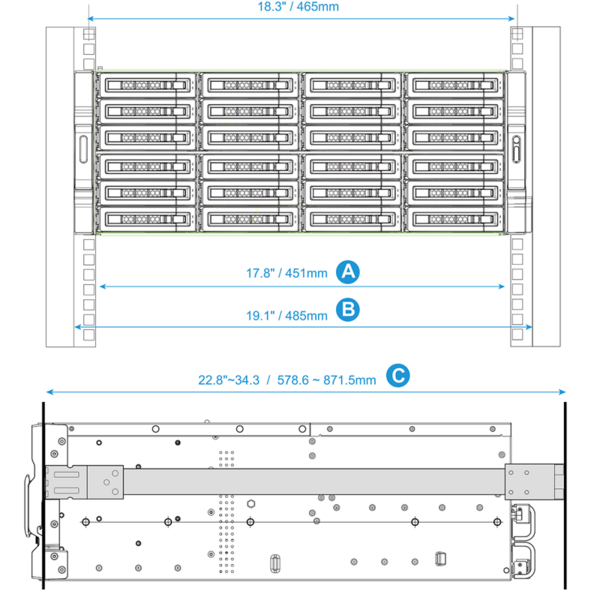 - Ширина монтажной стойки ?17.8"/451мм, ширина панели ?19.1"/485мм, установочная глубина 22.8~34.3"/578.6~871.5мм