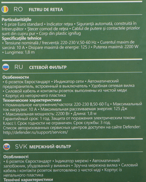 DEFENDER 99489 Сетевой фильтр 1.8M DFS 151 6OUTL.
