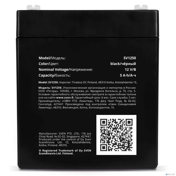 SVEN SV 1250Battery (12V 5Ah), 12V voltage, 5A*h capacity, max. discharging rate of 80A, max. charging rate 1.5A, the type of lead-acid AGM, type lead terminal F1