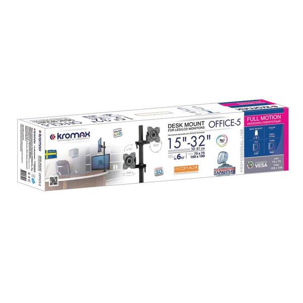 Кронштейн для мониторов ЖК Kromax OFFICE-5 серый 15"-32" макс.12кг настольный поворот и наклон