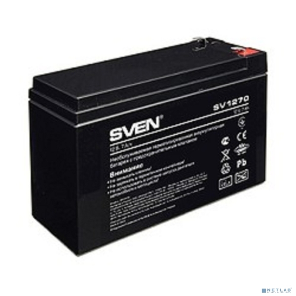 Battery SVEN SV 1270 (12V 7Ah), 12V voltage, 7Ah capacity, max. discharging rate of 105A, max. charging rate 2.1A, the type of lead-acid AGM, type lead terminal F2