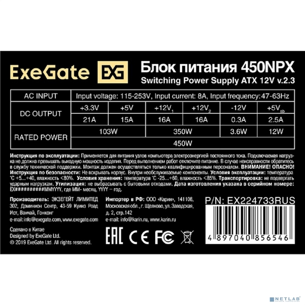 Блок питания Блок питания 450W Exegate 450NPX, ATX, black, 12cm fan, 24+4pin, 6/8pin PCI-E, 3*SATA, 2*IDE, 1*FDD