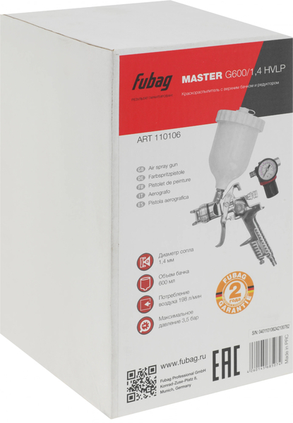 - Краскораспылитель Fubag MASTER G600/1.4 HVLP с верхним бачком для финишных работ. Высокий процент переноса краски (до 85%). Экономия краски одновременно с качеством покрытия. Регулировка расхода воздуха, расхода ЛКМ, формы факела. Поставляется с редуктором, который позволяет регулировать давление.