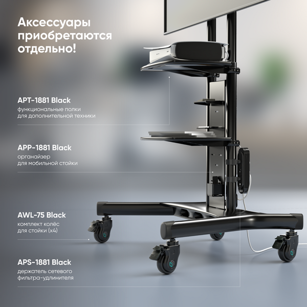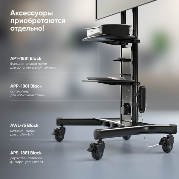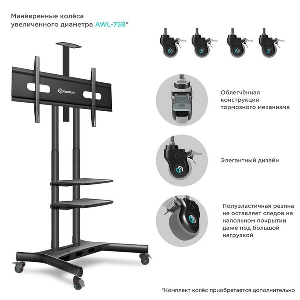 Мобильная стойка ONKRON на 1 ТВ 55-80" от 200 х 200 до 800 х 500, макс нагр 90, 9кг, портретная / альбомная ориентация, высота 1050-1650 мм, черный