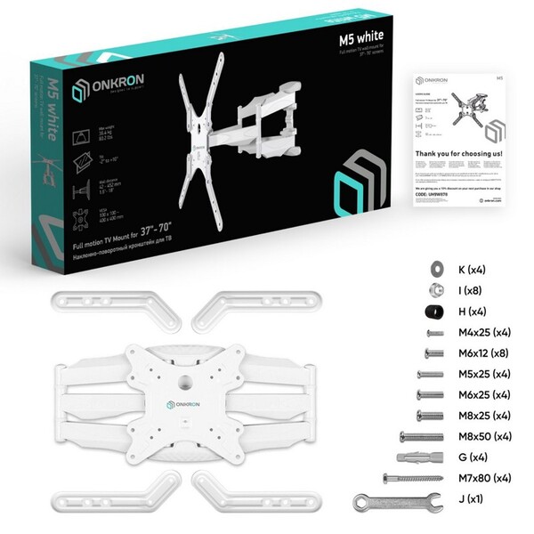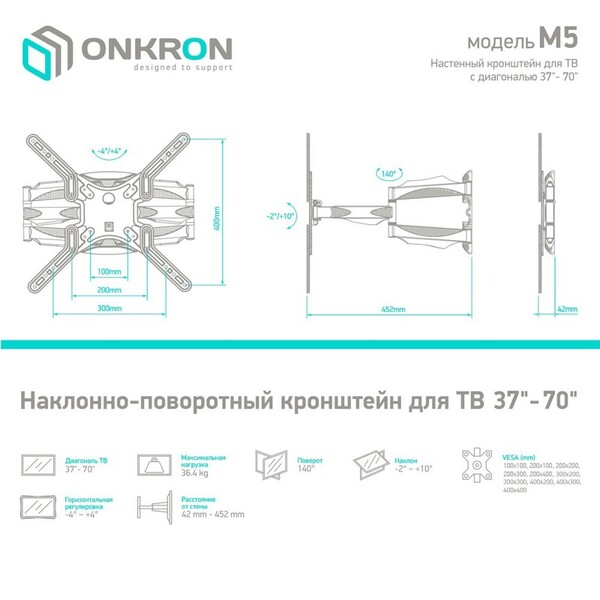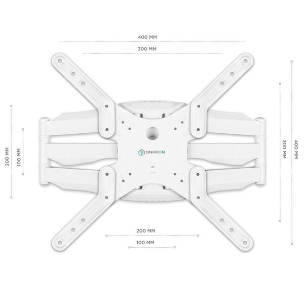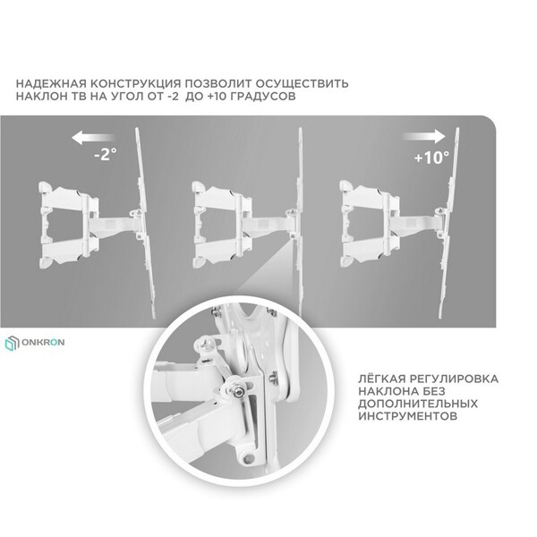 Кронштейн ONKRON 32-60" макс 400 х 400 наклон -2° / +10° поворот 140?, Макс нагрузка 36, 4 кг от стены: 42-452 мм, белый