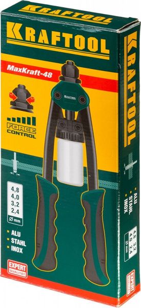Заклепочник двуручный компактный KRAFTOOL "MaxKraft-48" для заклёпок из Al, стали, нерж стали d=2,4/3,2/4,0/4,8мм, силовой, усил литой корпус [31161] купить в интернет-магазине TPShop.Ru. Наличный и безналичный расчет, розничные и оптовые продажи. Самовывоз, доставка по Москве и МО, отправка во все регионы России.