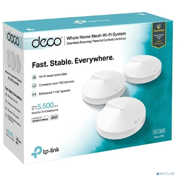 Домашняя Mesh Wi-Fi система TP-Link Deco M5 (3-pack), AC1300 3 устройства, до 400 Мбит / с на 2, 4 ГГц + до 867 Мбит / с на 5 ГГц, 4 встр. антенны, 2 гиг. порта (автоопределение WAN / LAN)