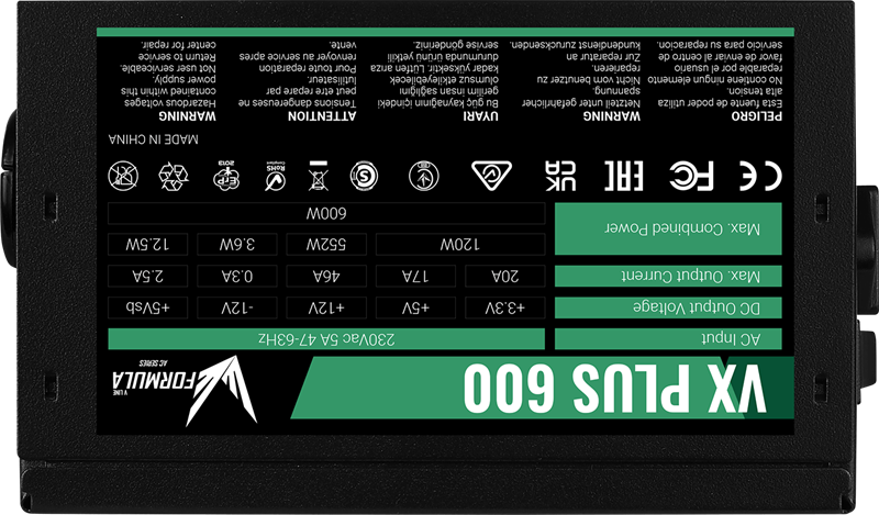 Aerocool Retail VX PLUS 600 ATX v2.3 600W Haswell, fan 12cm, 500mm cable, power cord, 20+4P, 4+4P, PCIe 6+2P x2, PATA x3, SATA x4, FDD