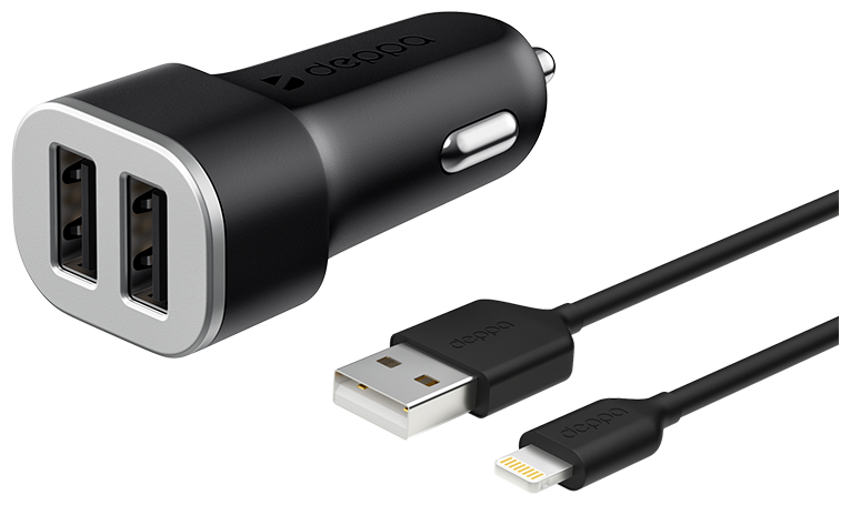 Deppa 11285 Автомобильное зарядное устройство 2 USB 2.4А + кабель Lightning, MFI, черный
